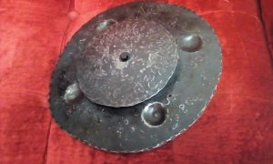 Ready for this unique ultimate setup for your gongs ? Features a central 28'' central space with 5 surrounding hooks. Hand hammered steel with brushed clear finish. Gongs not included but can be made to order.